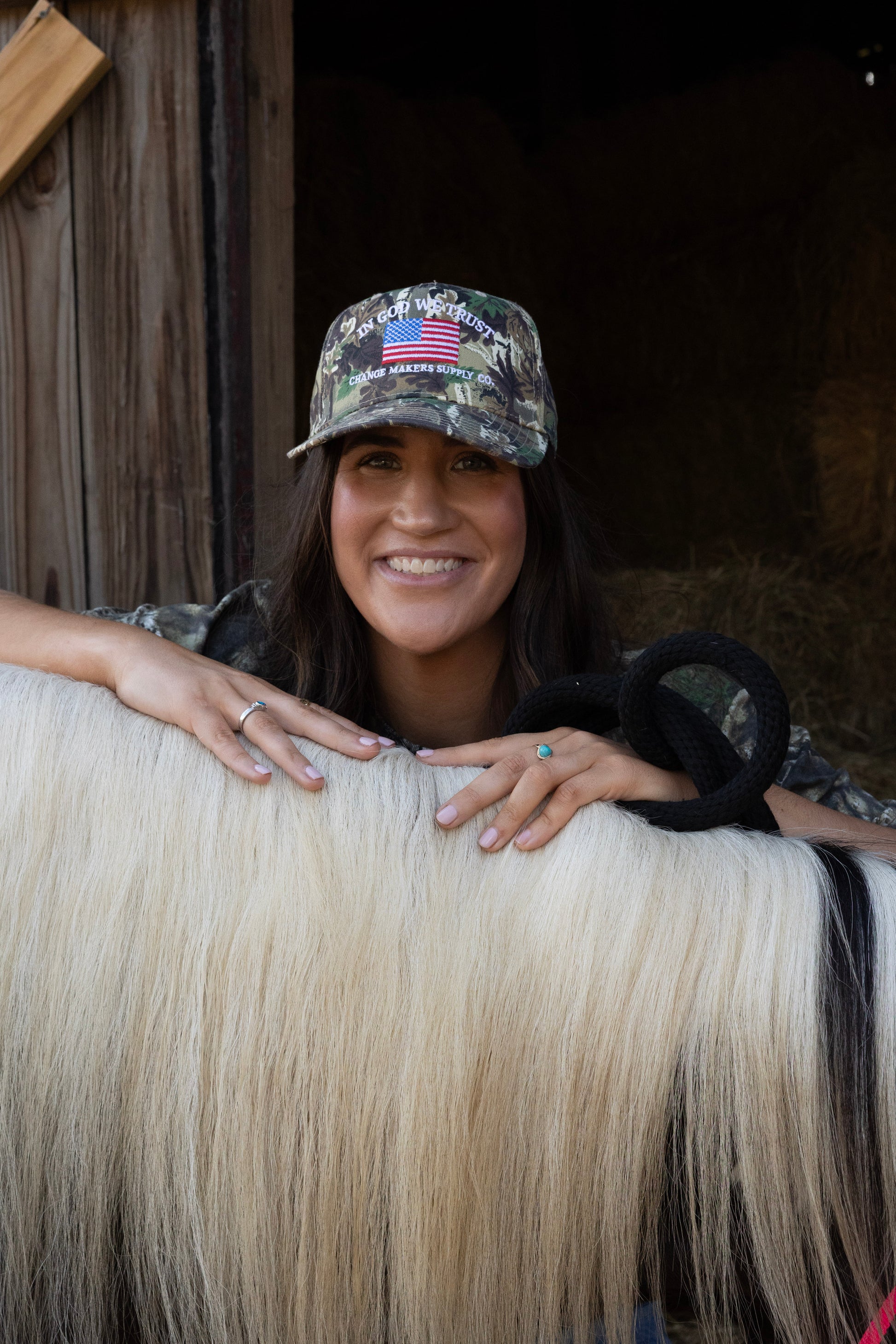 Cotton twill five panel camo trucker hat with velcro back closure and flag and words embroidered.