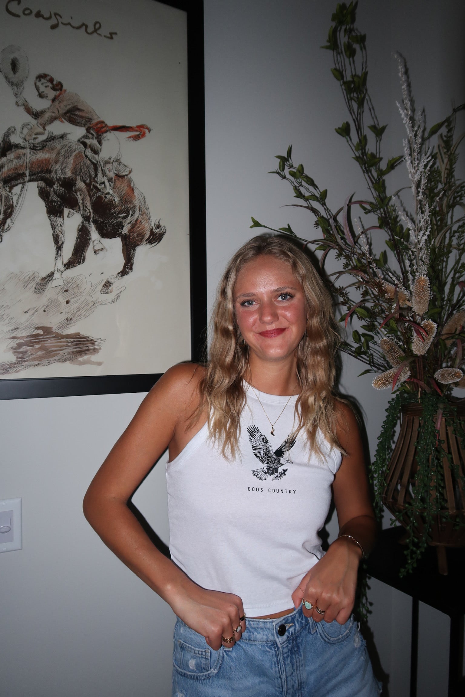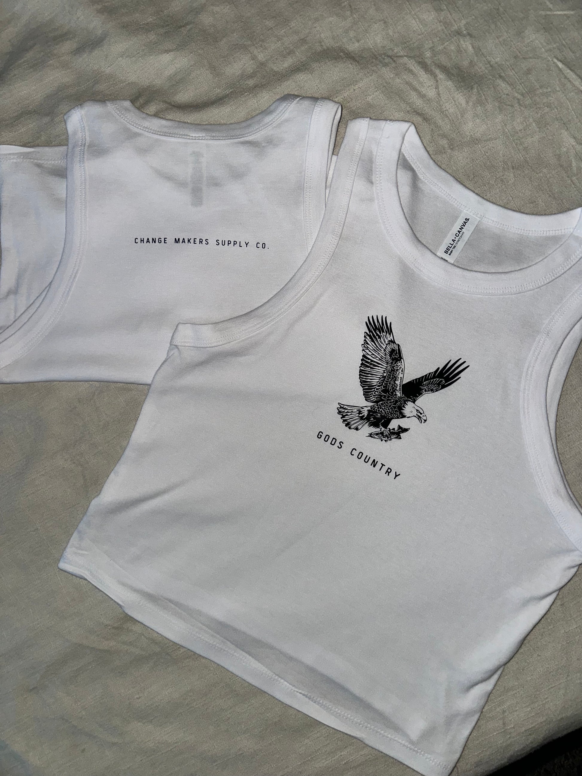 Introducing the Gods Country micro rib racer tank. Showcasing an eagle design on the front and Change Makers Supply on the back, this tank is perfect for making a statement.