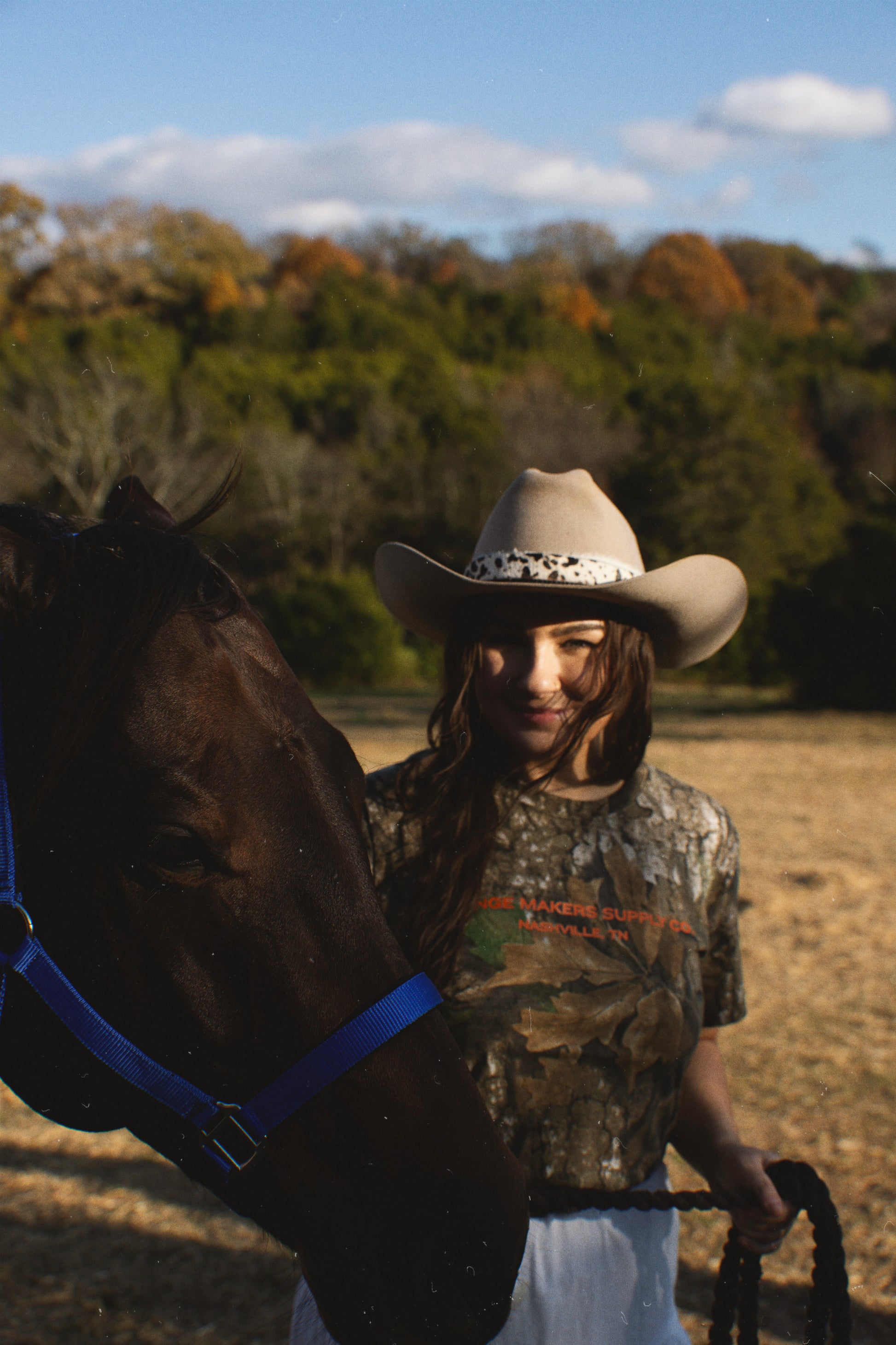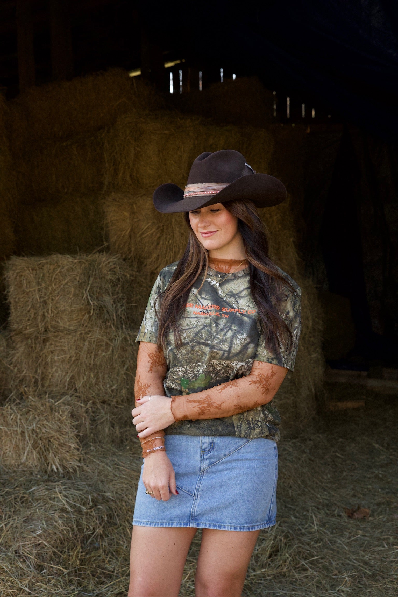camo t-shirt with orange print.